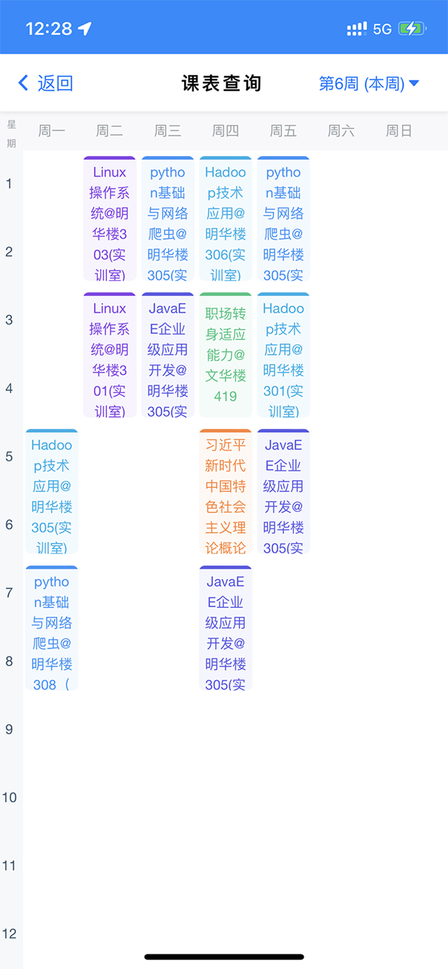 1.点击“课表查询”应用图标,进入成绩查询服务,学生和教工用户可查看本学期应上的所有课程,可点击课程查看上课详细信息,包括课程名称、上课地点、授课老师、上课节次、上课周次。