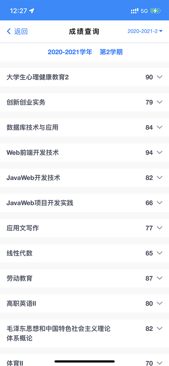 2.点击“成绩查询”应用图标,进入成绩查询服务,学生用户可查看入学至今所有学期的成绩信息,可点击右上角“学期”切换学期查看;点击成绩右侧展开按钮,可查看该课程的学分、课程性质、考核方法、记分、修读方式、修读方式信息。