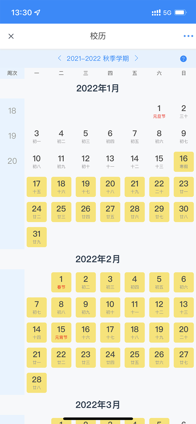 3.点击“校历查询”应用图标,进入校历查询服务,用户可切换学期查看不同学期校历,且根据校历添加自己的日程;校历会特殊展示学校设定的节假日及日程。校历按月份展示,可上下滑动查看。