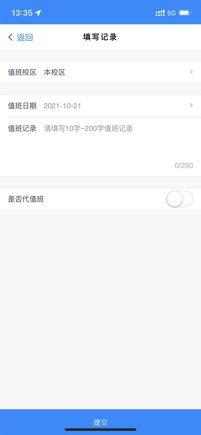 5.点击“值班记录”应用图标,进入值班记录服务,用户可点击右上角添加值班记录,填写值班校区、值班日期、值班记录说明后提交,即可在服务首页查看到自己的值班记录。