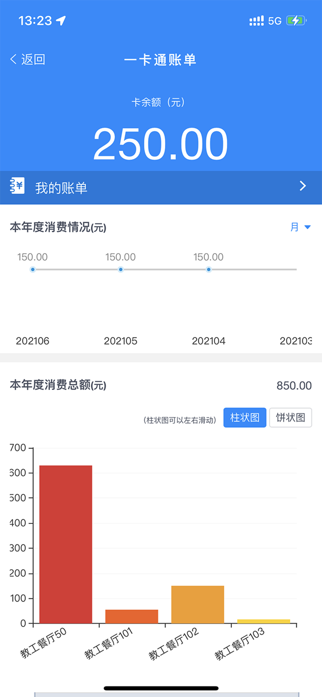 6.点击“一卡通账单”应用图标,进入一卡通账单服务,用户可查看自己一卡余额,一卡通消费记录。支持柱状图,饼状图多种类型图形展示,展示内容可根据校方需求制定。点击我的账单,可查看自己的一卡通消费明细。