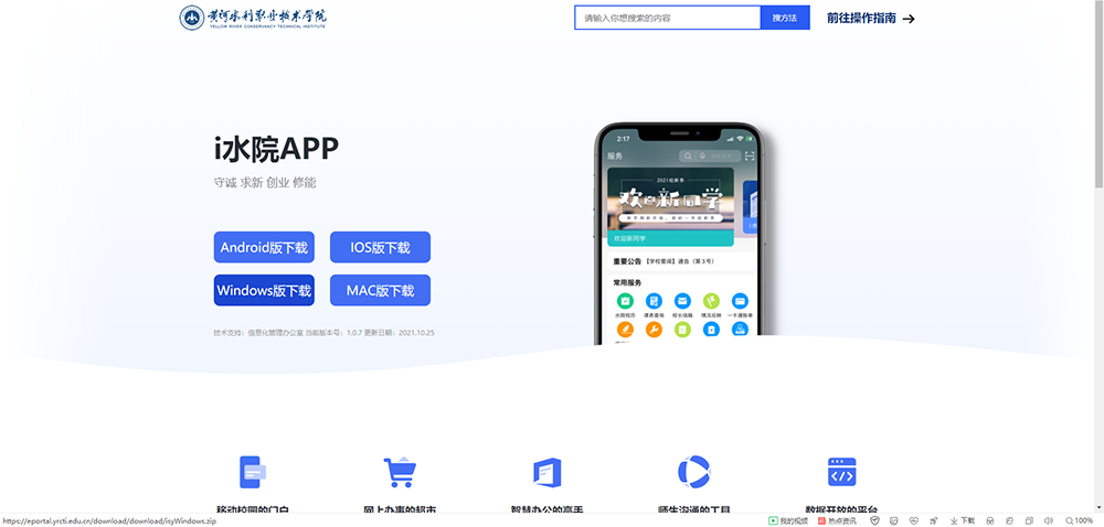 PC客户端下载地址:https://eportal.yrcti.edu.cn/download/ 用户可以打开电脑客户端下载地址,就可以看到i水院电脑客户端下载入口,用户可根据自己电脑操作系统类型,选择对应的版本。
