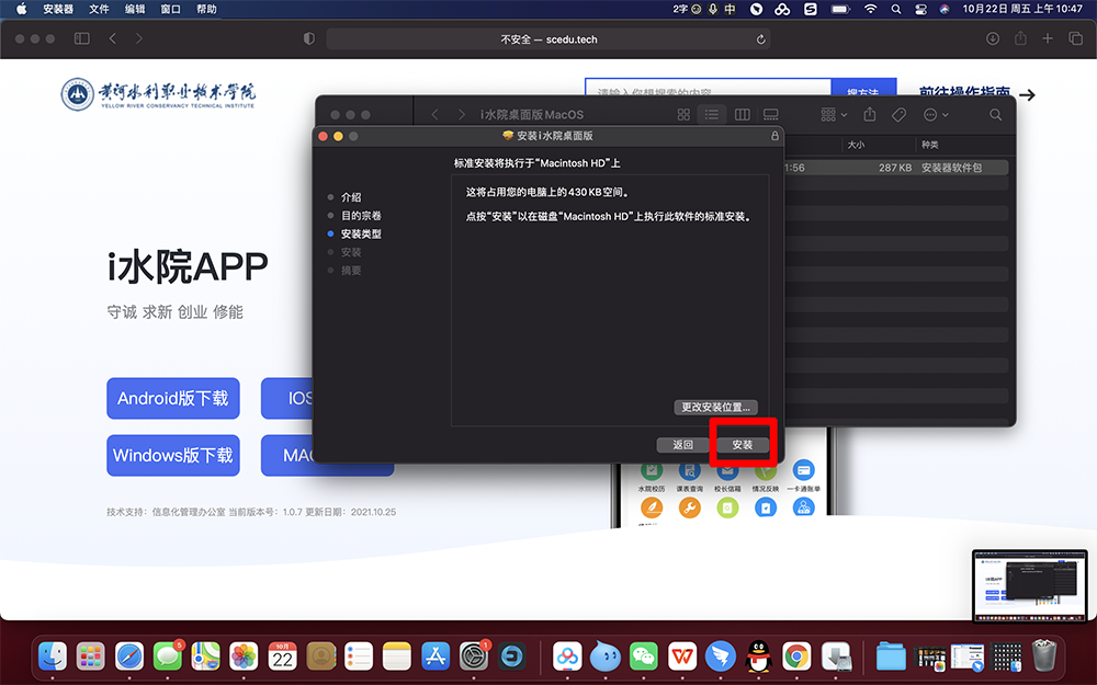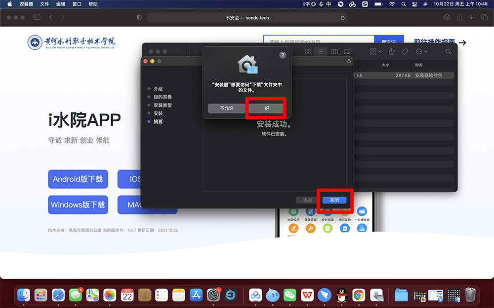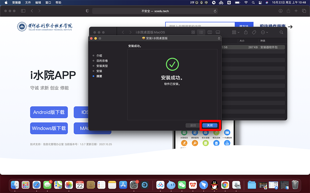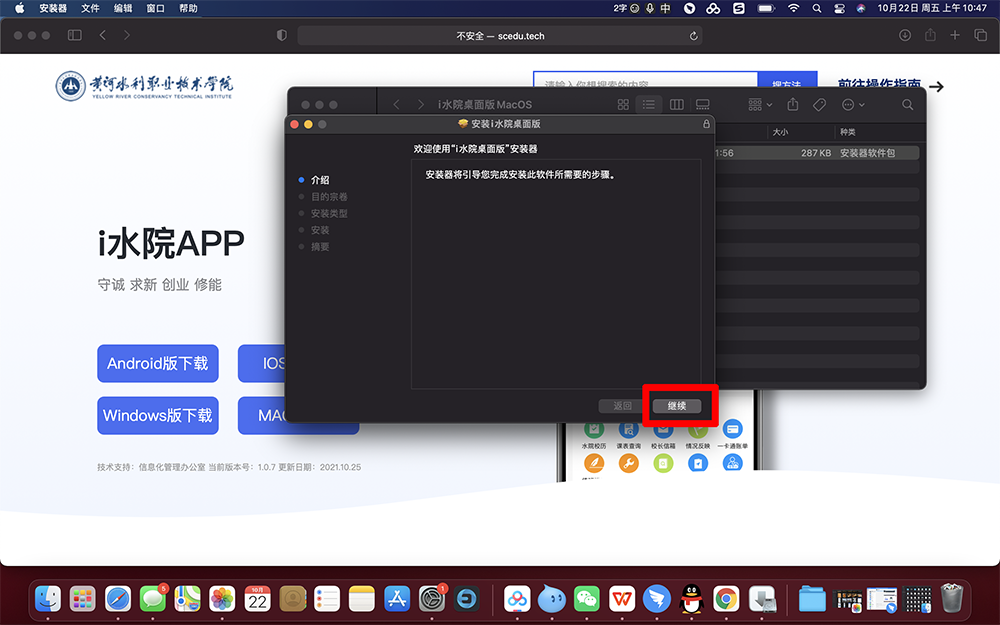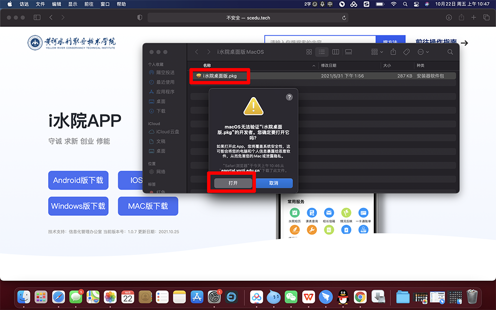 3.打开后出现的=“i水院桌面版.pkg”,点击右键选择打开,在弹出的对话框中选择“打开”。