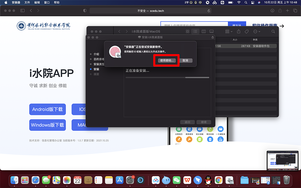 5.根据系统提示,输入MAC的密码或按压指纹授权继续安装。