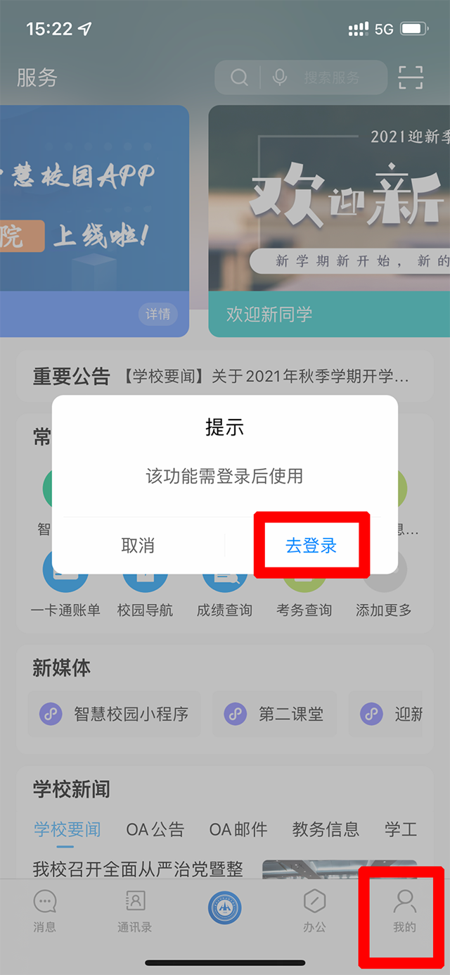 6.登录成功。如果密码错误,请持本人身份证或校园卡至四号实训管东门一楼智慧校园服务大厅办理更改手续。