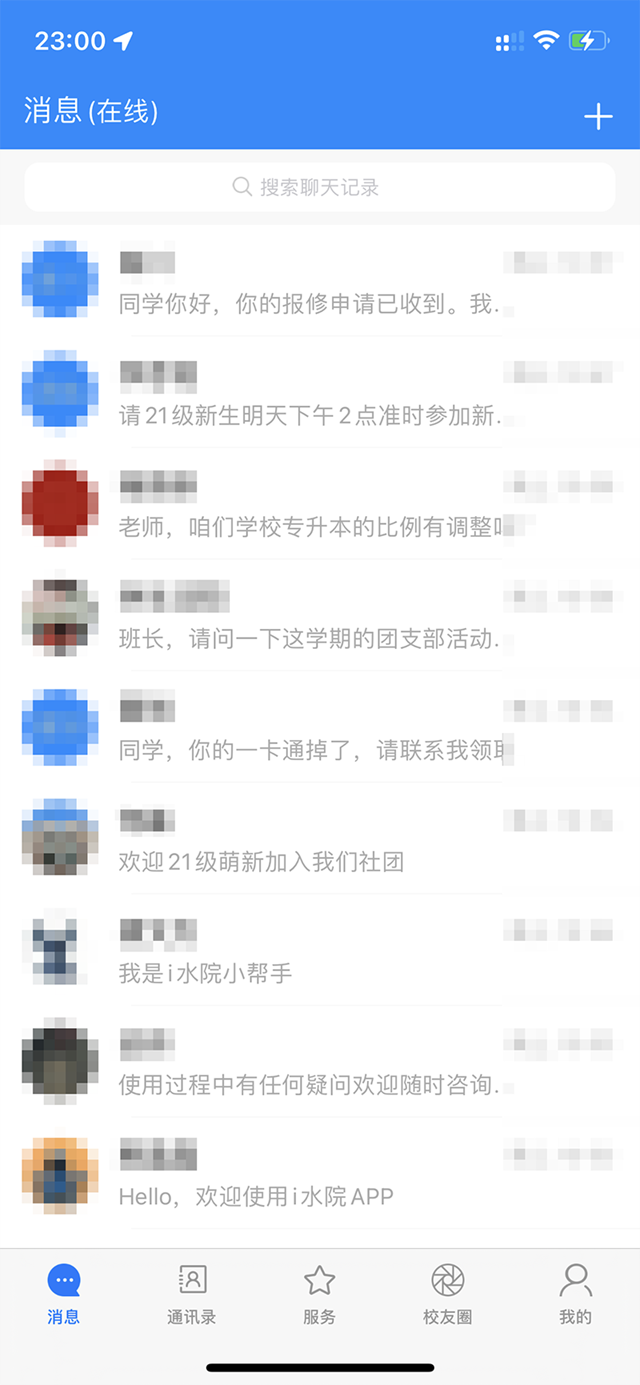 下图为消息列表页面,展示所有最近的聊天信息,包括单聊消息、群聊消息、好友通知、服务提醒、订阅号消息、部门号消息。