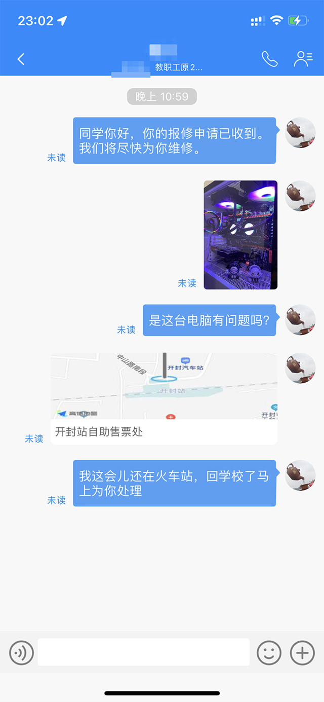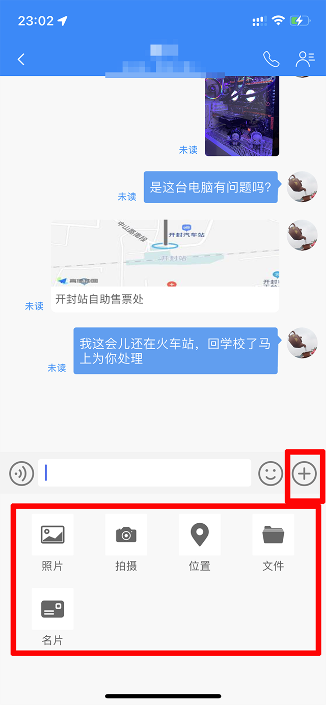 ①点击“消息列表”,进入对应的消息列表,查看聊天消息详情,同时可以发起聊天。 下图为聊天消息详情页面,用户可以发送文本、表情、图片、语音等基本类型的消息,也可以发送名片、位置、文件等消息。