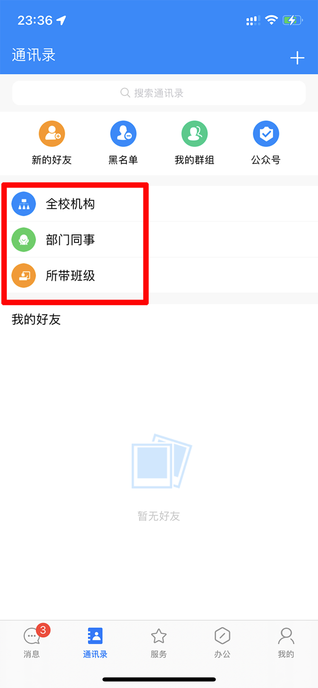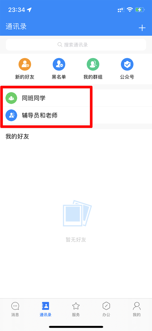 点击底部导航栏“通讯录”进入通讯录界面; ①教职工用户:可以查看新的好友、黑名单、我的群组、公众号、全校机构、部门同事、所带班级以及我的好友列表,如下: