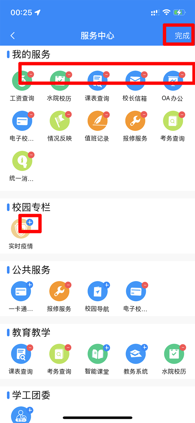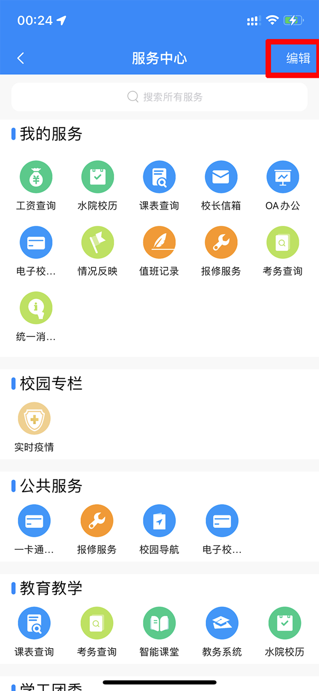 ①在服务大厅页面点击编辑按钮进行我的服务编辑,点击完成按钮保存设置。我的服务可以添加多个,但大于14个时,剩余的将不会出现在服务页面。用户可以拖动服务改变服务展示顺序。如下: