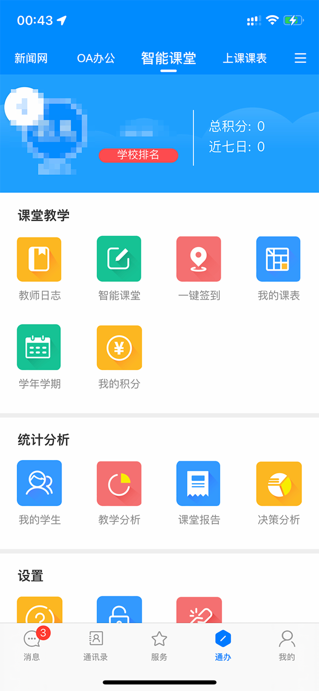 ①用户点击底部导航栏“通办”进入通办模块,根据角色的不同,您可能看到的内容会有所不一致,例如下图所示显示有新闻网、一网通办、上课课表、智能课堂等。 下图为通办模块中的智能课堂页面(顶部为切换按钮):
