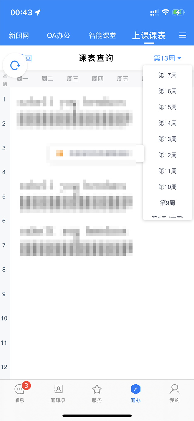 ①用户点击底部导航栏“通办”进入通办模块,根据角色的不同,您可能看到的内容会有所不一致,例如下图所示显示有新闻网、一网通办、上课课表、智能课堂等。 下图为通办模块中的上课课表页面(顶部为切换按钮):