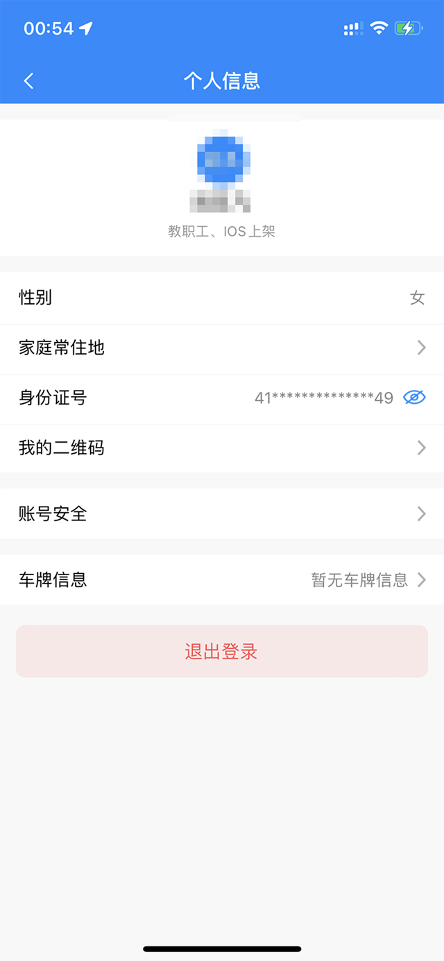 ①用户点击个人中心页面的个人信息或者头像,进入个人信息页面,可以进行个人信息的编辑。教职工提供车牌信息这一选项,点击可进入我的车牌这一微服务。如下: